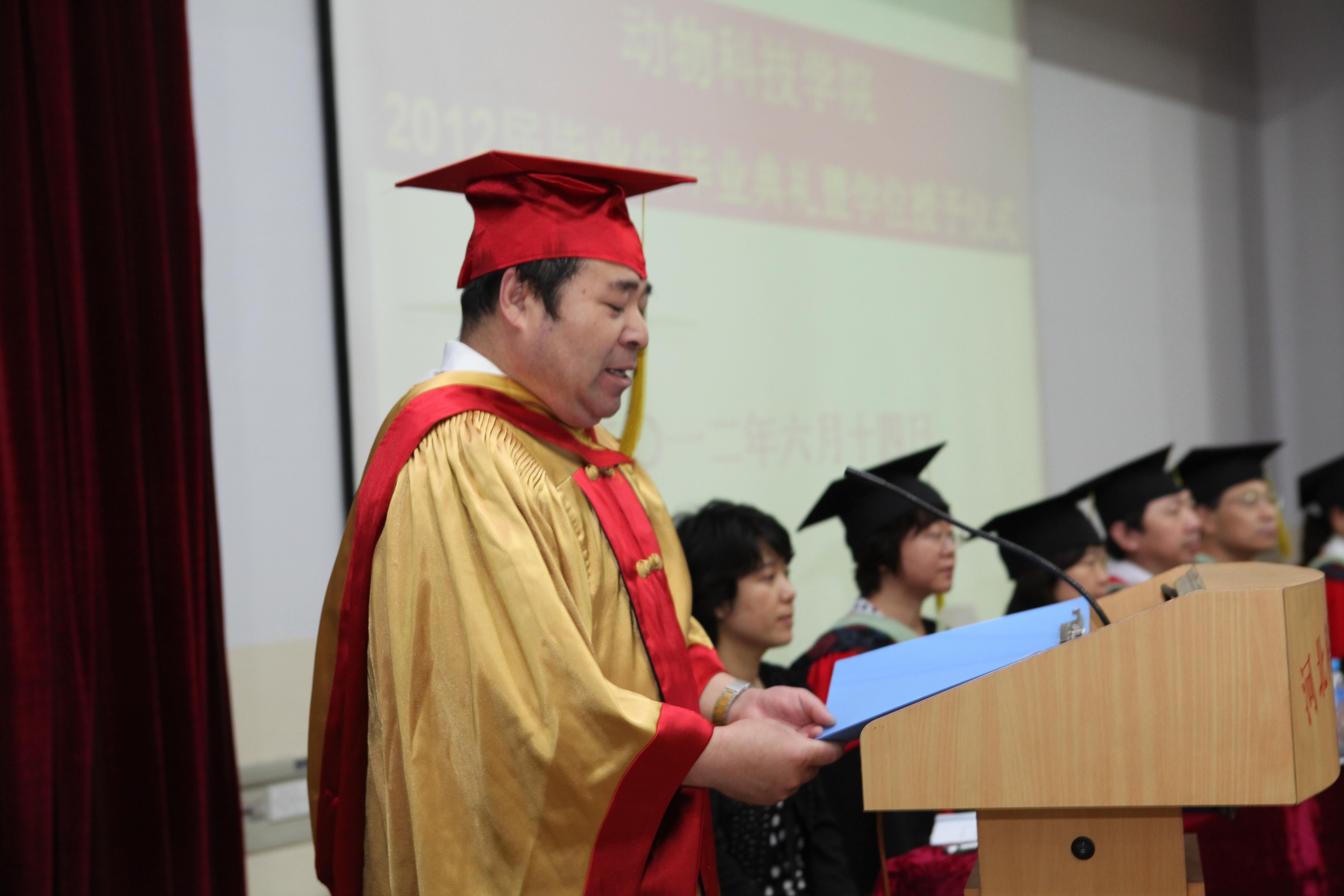 张香斋教授代表指导教师发言,她希望同学们认认真真做事,踏踏实实做人,为母校增光。动物医专业毕业生赵国星同学代表所有学士学位获得者发言,他感谢学校老师的悉心教导,表示将不负母校期待,在新的工作岗位上为国家和社会做出新的更大的贡献。09级动物科学专业曹焱同学代表全院在校生发言,她对即将离开母校的师哥师姐表示美好的祝福。