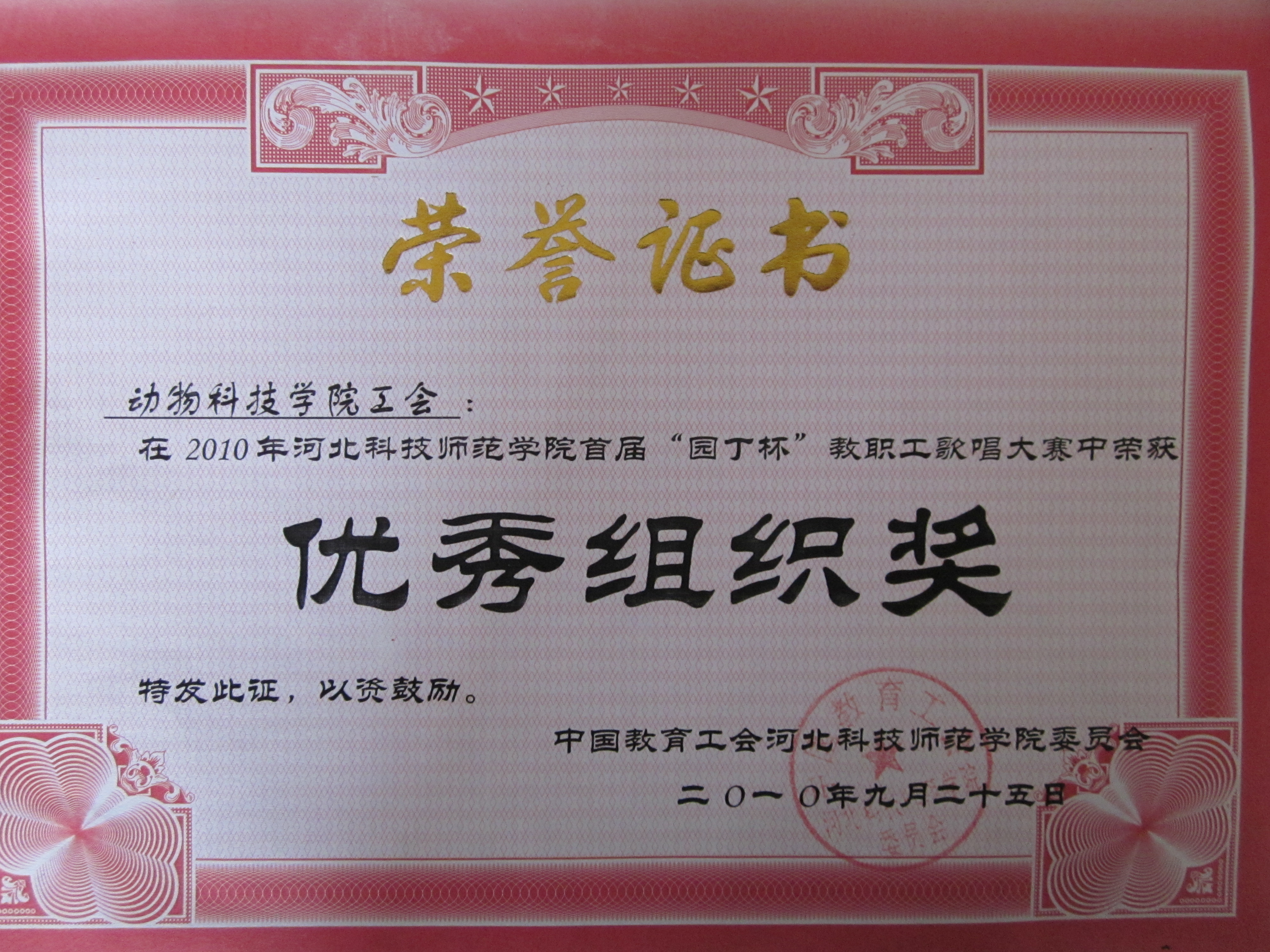 喜讯四:我院工会在2010年校首届“园丁杯”教职工歌唱大赛中荣获“优秀组织奖”
