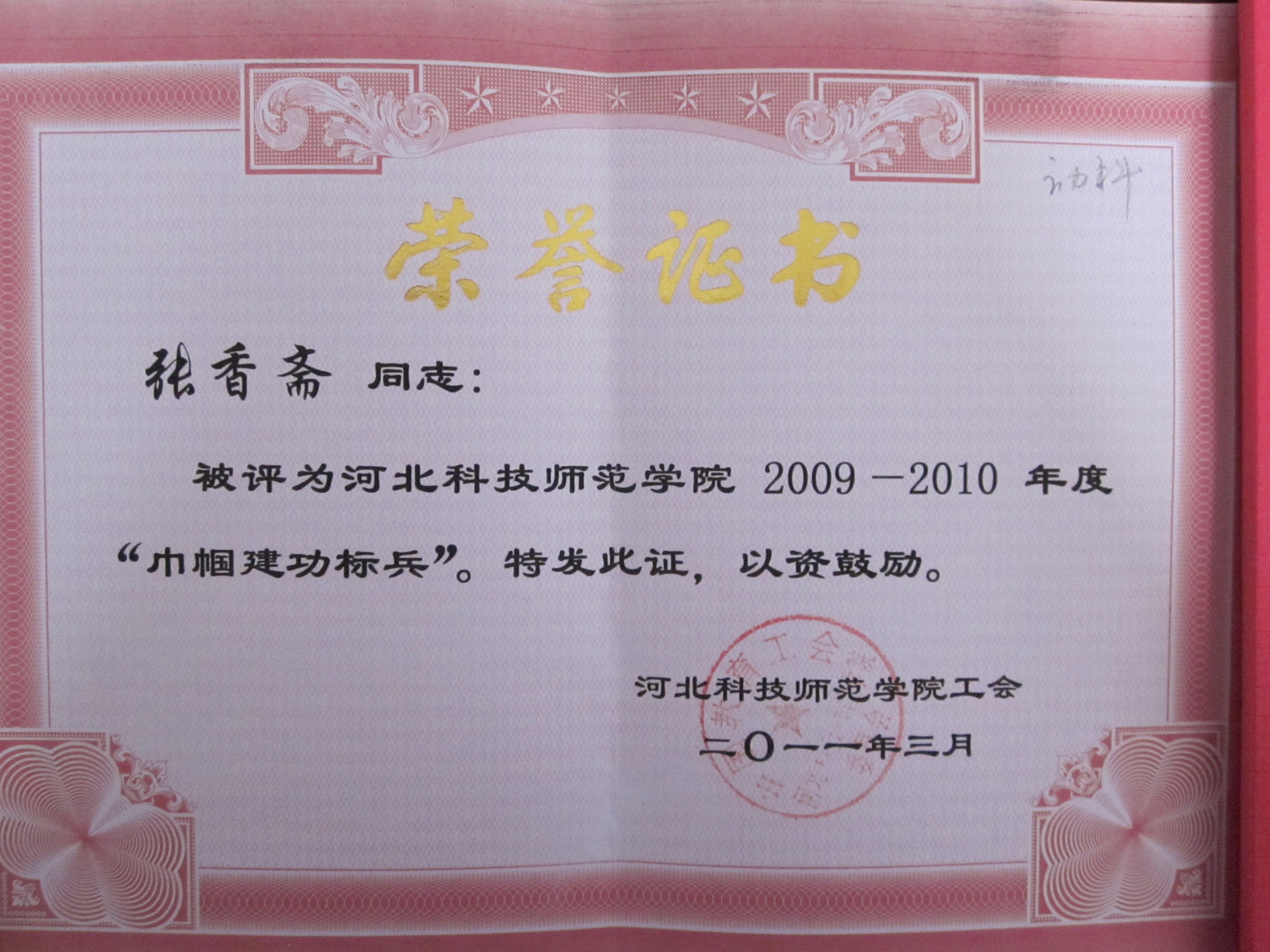 喜讯三:我院张香斋老师被评为河北科技师范学院2009-2010年度“巾帼建功标兵”
