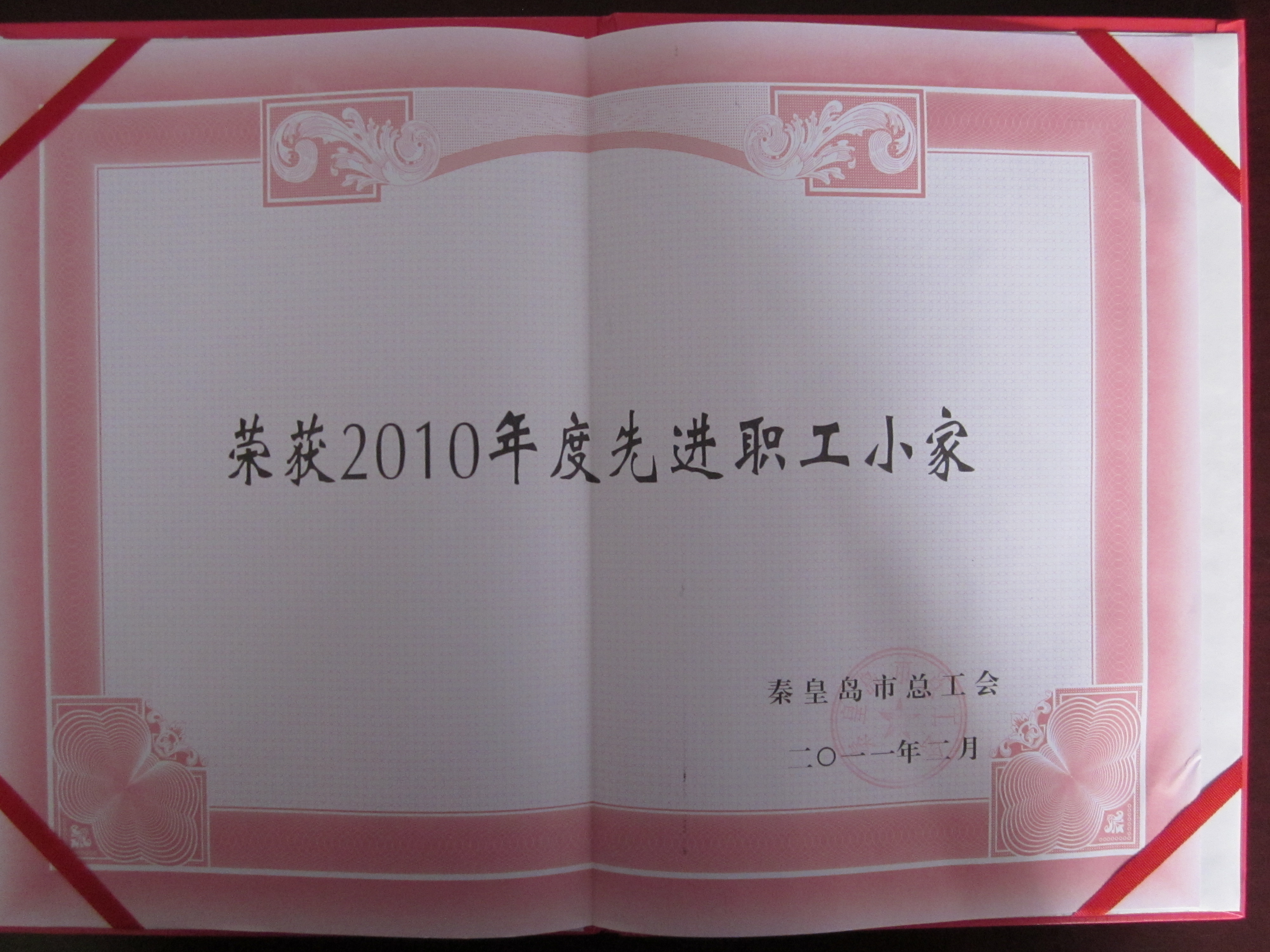 喜讯一:我院被秦皇岛市总工会授予“2010年度先进职工小家”荣誉称号