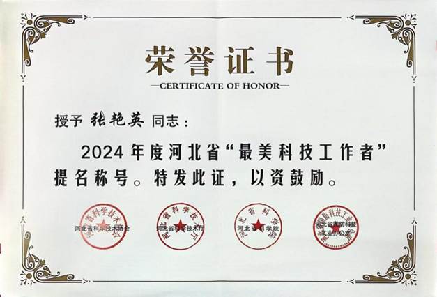 近日,我院张艳英教授在2024年度的河北省“最美科技工作者”提名及评选活动中荣获“最美科技工作者”提名称号。该荣誉由省科技厅、省科学技术协会、省科学院、省国防科技工业合作办公室联合颁发,旨在弘扬科学家精神,激发科技工作者责任感。