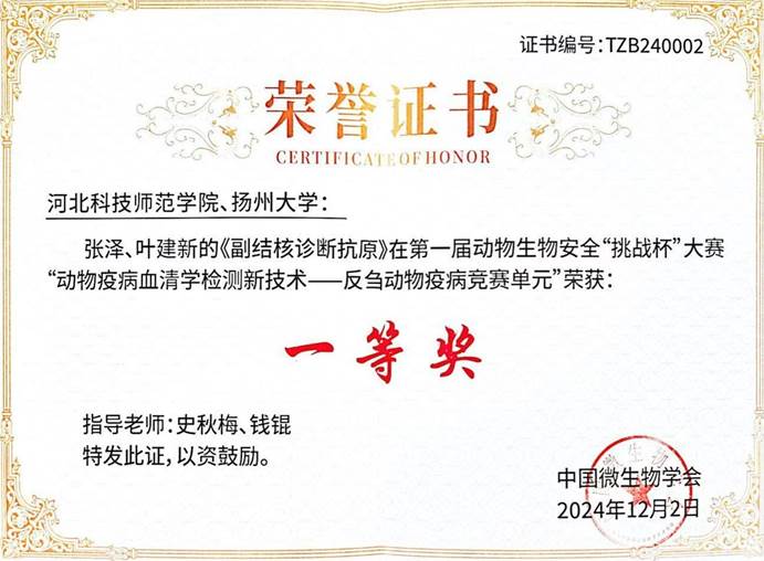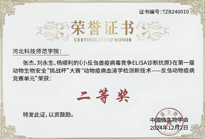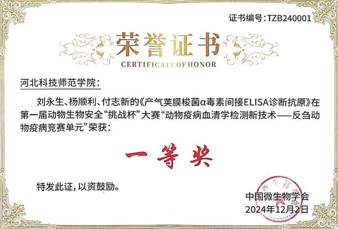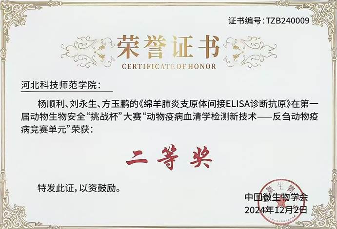 大赛聚焦动物疫病血清学检测技术创新和反刍动物疫病诊断抗原质量提升,在“动物疫病血清学检测新技术一反刍动物疫病竞赛单元”,我校教师刘永生、杨顺利、付志新的《产气荚膜梭菌α毒素间接ELISA诊断抗原》作品荣获一等奖;史秋梅老师和扬州大学钱锟老师指导的《副结核诊断抗原》作品荣获一等奖;张杰、刘永生、杨顺利的《小反刍兽疫病毒竞争ELISA诊断抗原》作品荣获二等奖;杨顺利、刘永生、方玉鹏的《绵羊肺炎支原体间接ELISA诊断抗原》作品荣获二等奖。这些奖项的取得,充分展示了我校在兽医诊断、制品研发,特别是抗原制备方面的实力和技术水平,彰显了我校在动物生物安全领域的技术领先地位。